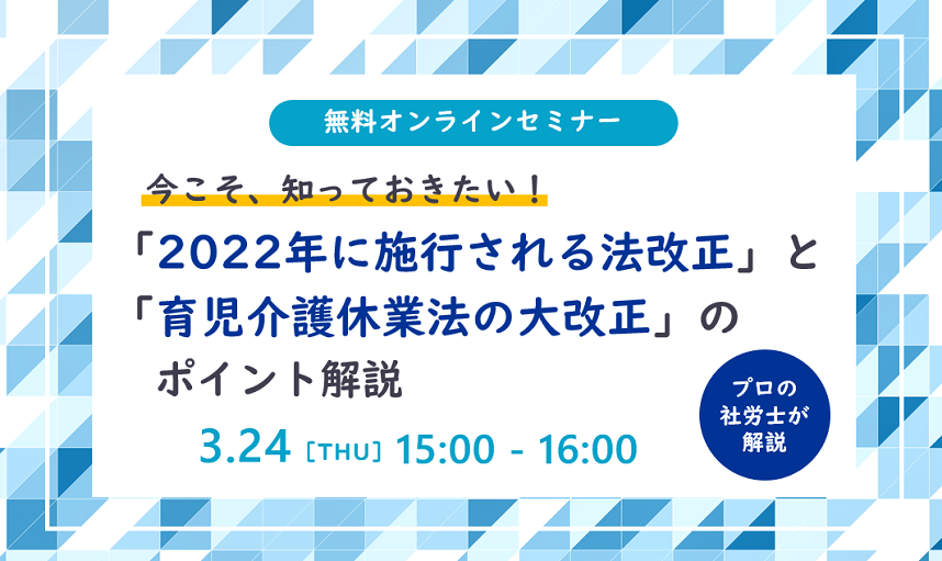 | テーマ | 「今こそ、知っておきたい! 2022年に施行される法改正と育児介護休業法大改正のポイント解説セミナー」 |