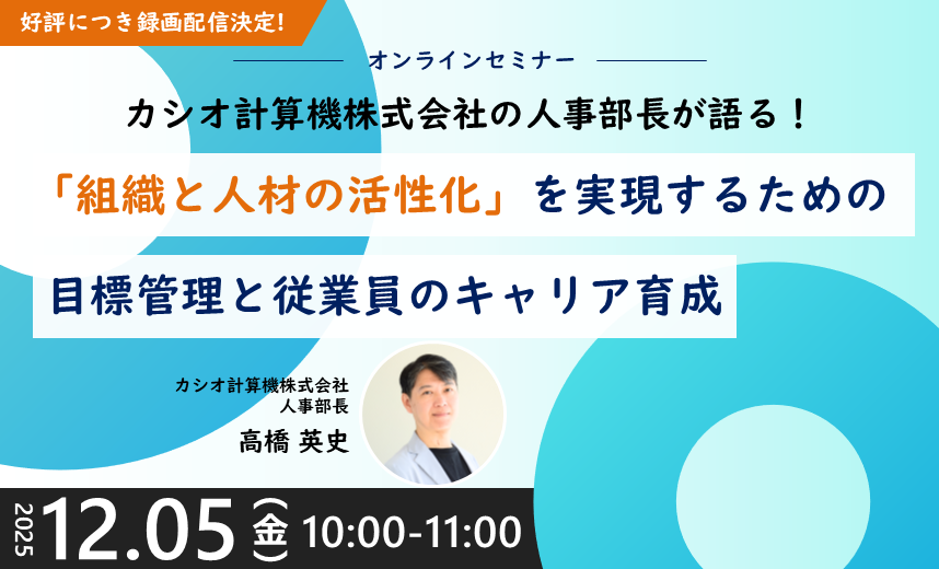 今回のウェビナーでは、カシオ計算機株式会社の人事部長の高橋氏より、カシオグループの人事制度のうち目標管理や従業員のキャリア育成に焦点をあて、「組織と人材の活性化」を実現するための方法についてご講演いただきます。