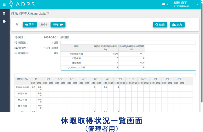 - 管理者用の画面では、未承認事項の数や部下の勤怠登録エラー、部下の休暇取得状況が分かりやすく表示され、管理者側の負担も軽減できます。